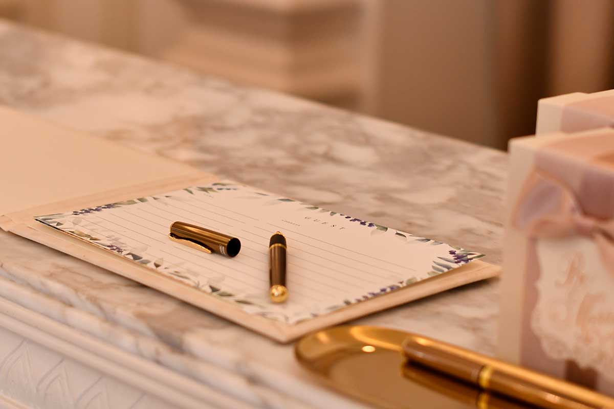 芳名帳と合わせて準備したいのが“記帳ペン”式場で用意されていることがほとんどですが、このご時世、使いまわすのは少し不安な声も…。羽がついたペンは豪華で、定番アイテム!みんなが必ず手にとるので、こだわりに気づいてくれるゲストも多いのではないでしょうか。