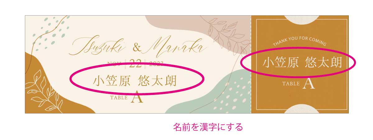 もちろんこのままご注文いただいてOKなのですが、席札とは違って、テーブルナンバーが記載してあったり、半券付だったりするので、ちょっとした変更など、ご要望にあわせてご対応させていただいているアイテムなのです。
