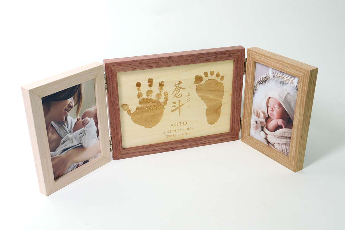手形足形を木製板にレーザー彫刻してお作りする温かみあふれるダブルフォトフレーム。