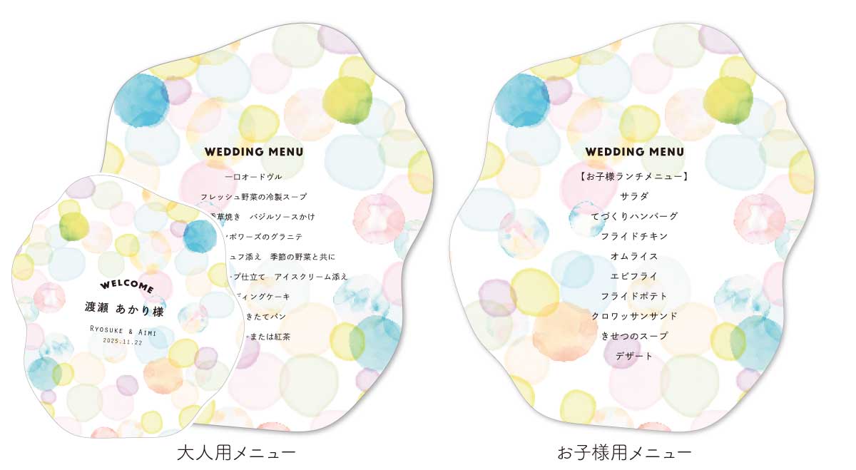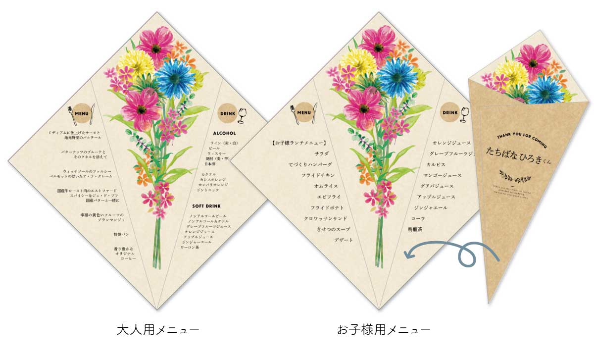 お子様用のメニューは、準備する数が少ないことから 用意されないケースや、簡易的なプリントを準備されるというケースが多いようですが、せっかくだったら お子様も大人と同じデザインのペーパーアイテムでお子様専用のものを準備してさしあげたいですよね。