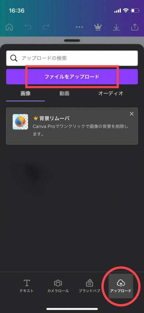 「アップロード」→「ファイルをアップロード」を押して、カメラロールから必要な写真を選択して追加。