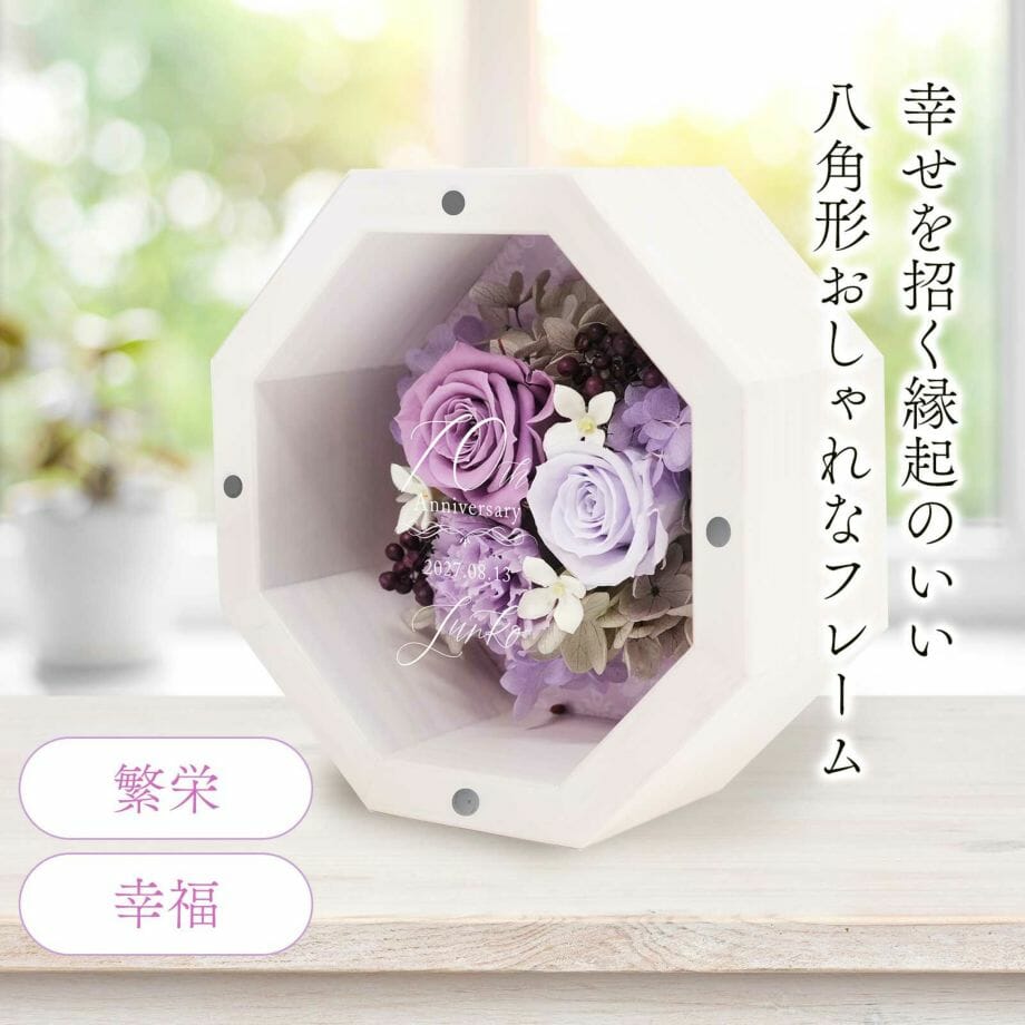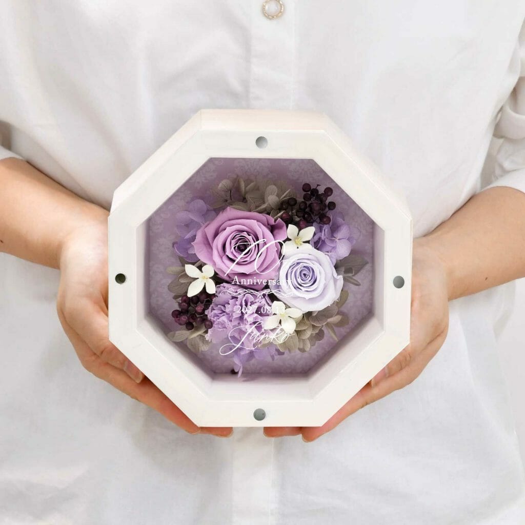 幸せを招くと言われる八角形のフレームに、古希・喜寿の色とされている紫色のプリザーブドフラワーのアレンジを閉じ込めました。