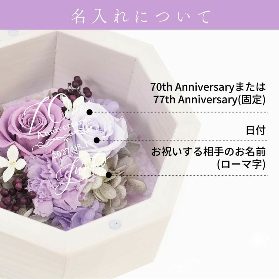 UV印刷で「70th Anniversary」or「77th Anniversary」の文字と日付、お祝いする相手のお名前が入るので、