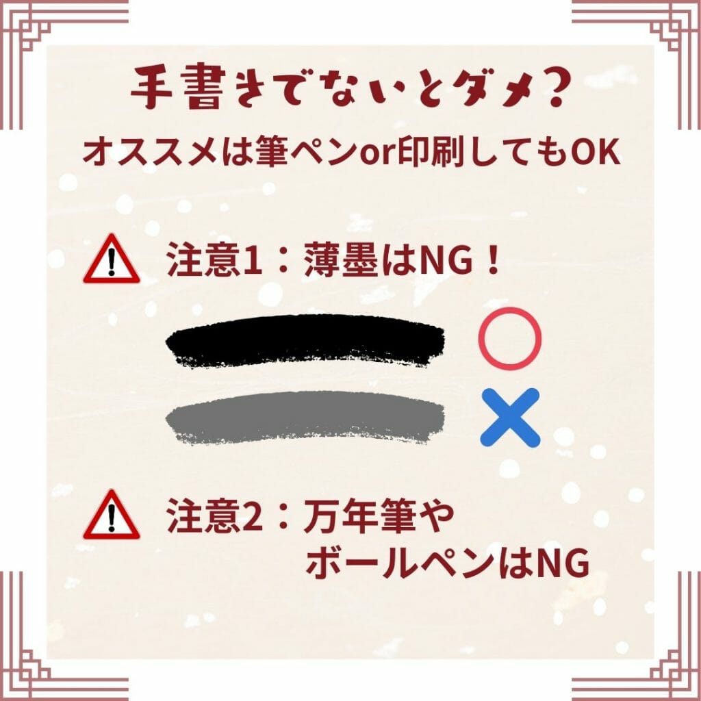 手書きでないとダメ!ということはありませんが、筆ペンや毛筆で手書きした方が、より丁寧な印象にはなるかもしれません。