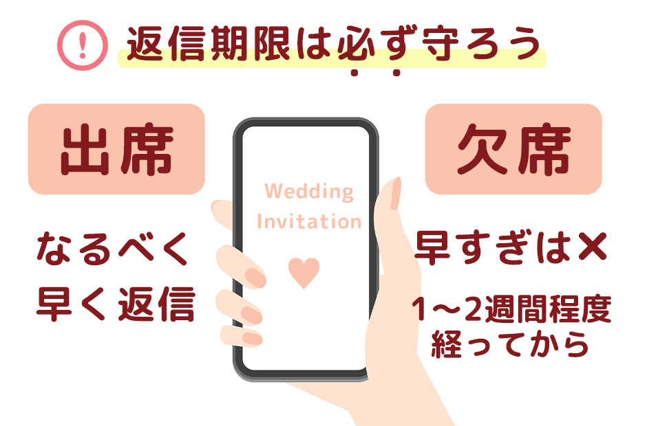 期限内に返信するのは大前提ですが、返信があまりに早すぎると「もともと来るつもりがなかったのかな」と新郎新婦に誤解を与えかねません。