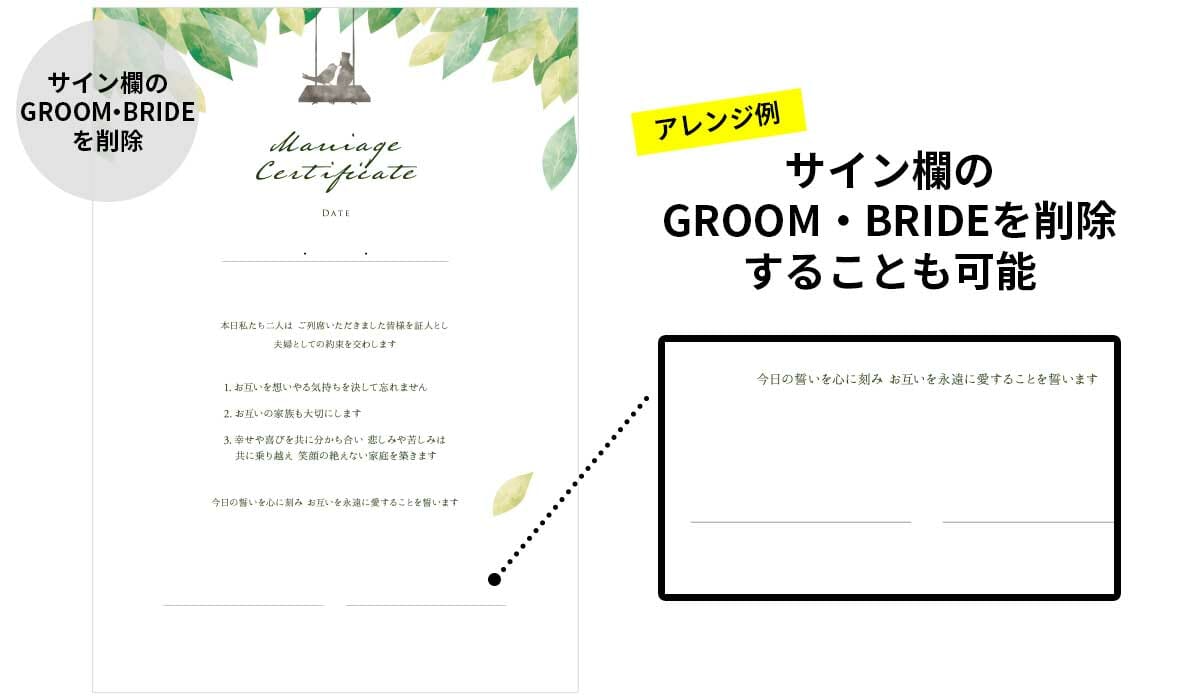 例えばサイン記入欄をGROOM、BRIDEをどちらも「SIGNATURE(サイン・署名)」に変更したり、GROOM、BRIDEの文字を削除したりすることも可能です。