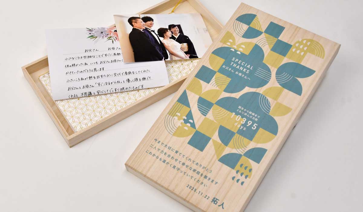 カラーはオレンジとブルーグリーンから選べ、桐箱には子育て感謝状として誕生日から結婚する日までをカウントした日数や、いままでの感謝を込めてメッセージを入れられる感動仕様になっています。