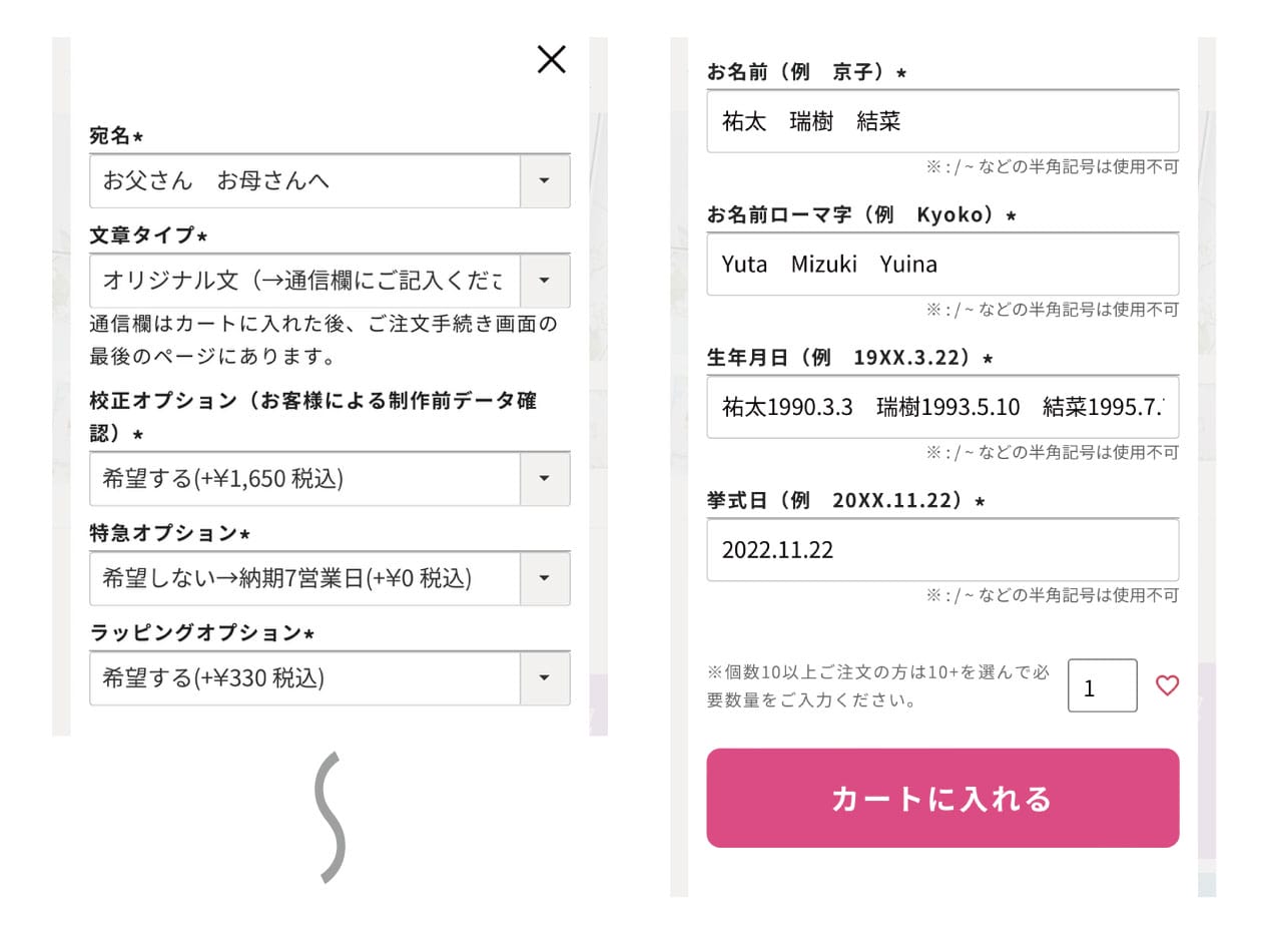 商品をカートに入れる際の入力選択項目は、こんな感じで入力をお願いします。