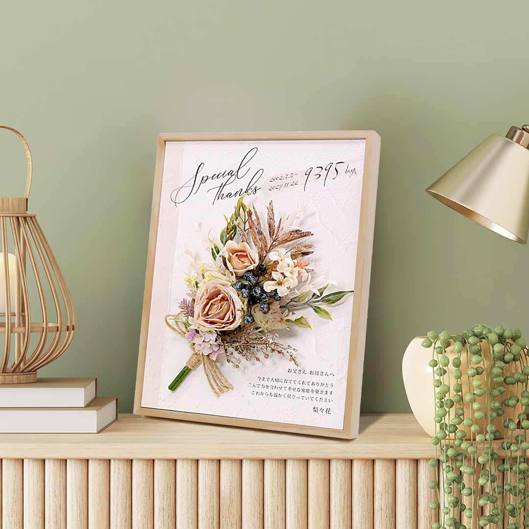 木目張りフレームに、ナチュラルテイストでまとめたアーティフィシャルフラワーのブーケをON