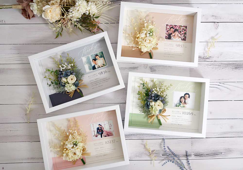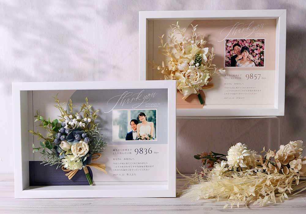 最新作の子育て感謝状「ダスティブーケ」は大き目のお写真で、ありがとうと大好きが一目で伝わる子育て感謝状。メッセージや数字は、アクリルにUV印刷。ナチュラルな木製フレームやニュアンスカラーのブーケは、あたたかみを感じさせてくれます♡