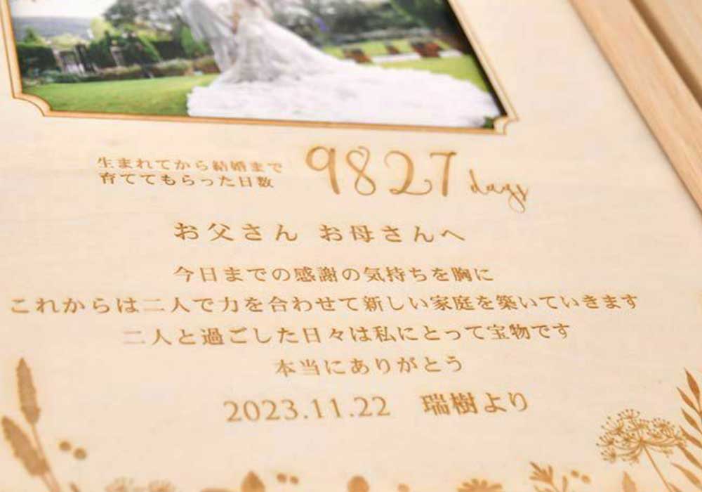 その他、こちら木にメッセージをレーザー彫刻するグレード高いタイプはプロにオーダーならではの仕様。贈り物だから絶対失敗したくない方は自作より安心ですね。