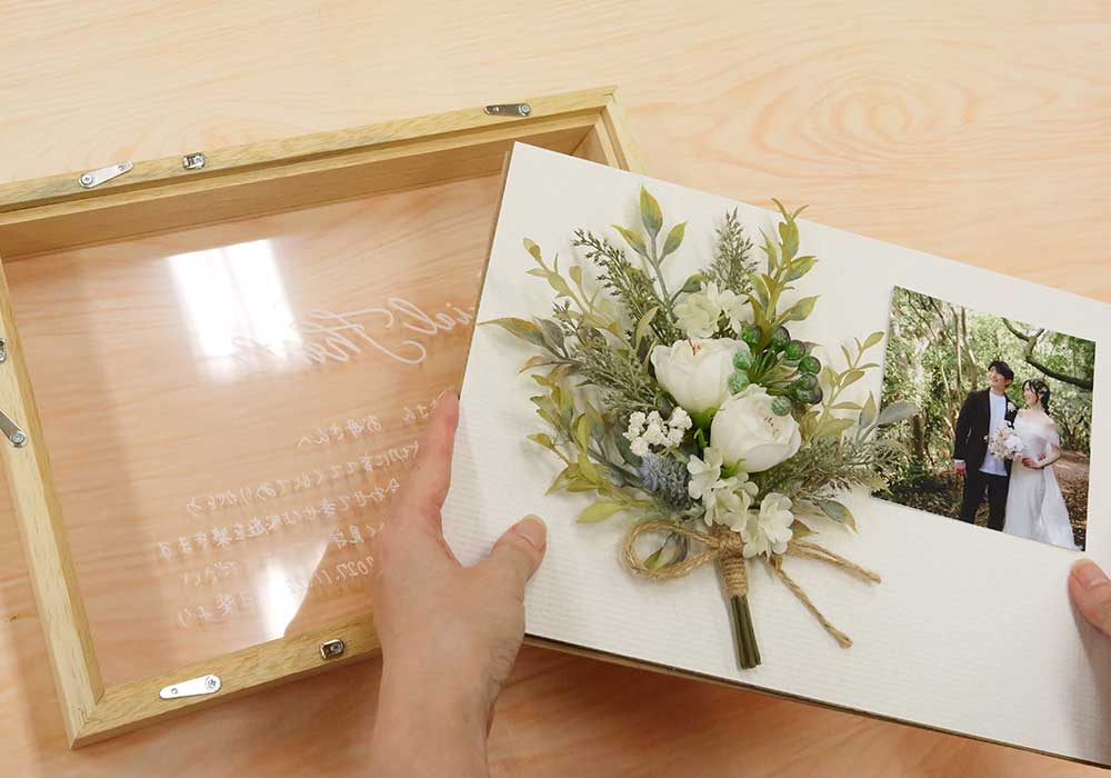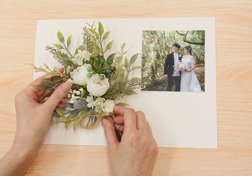 お花のアレンジはもちろん、写真補正&レイアウト、文字バランス・日数カウントすべてファルベが行います。お二人は注文して、写真を送付するのみ!