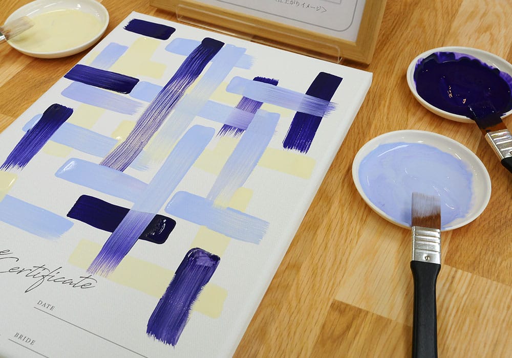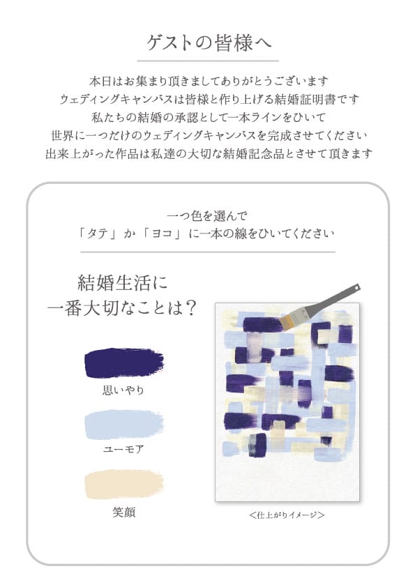 ウェディングキャンバスとはゲストがキャンバスに一筆ずつ縦や横色をペイントして完成させる参加型アイテム。