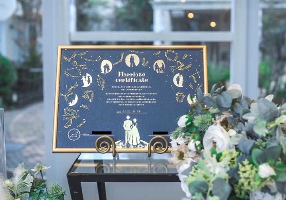 元々ゲスト参加型の結婚証明書を探していたおふたり。今までにない珍しいデザインで素敵だと思い、星座付き結婚証明書をご注文いただきました。