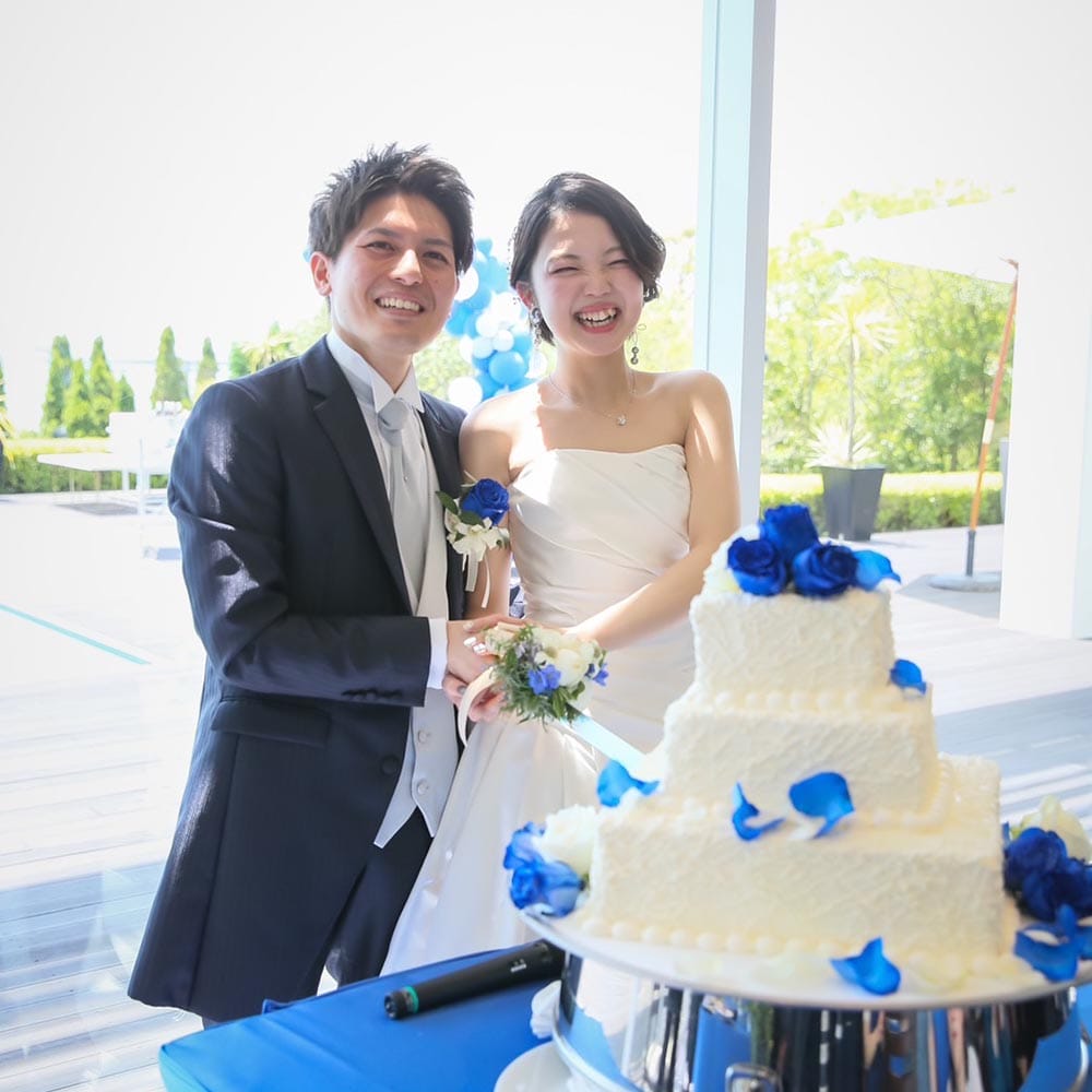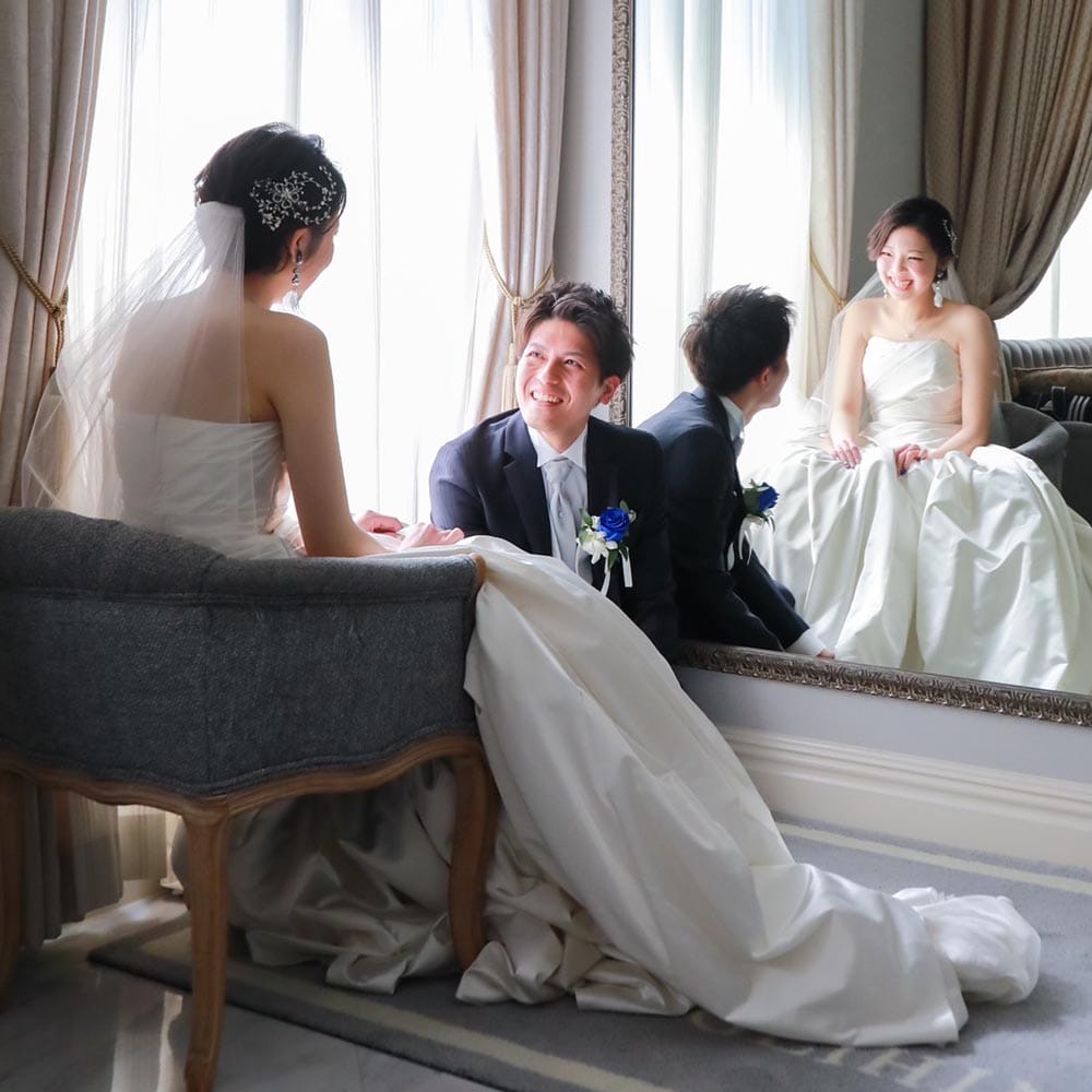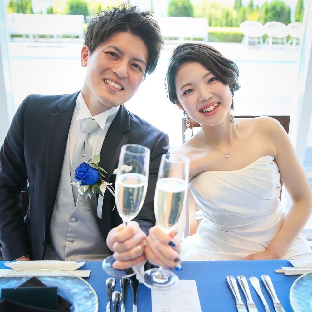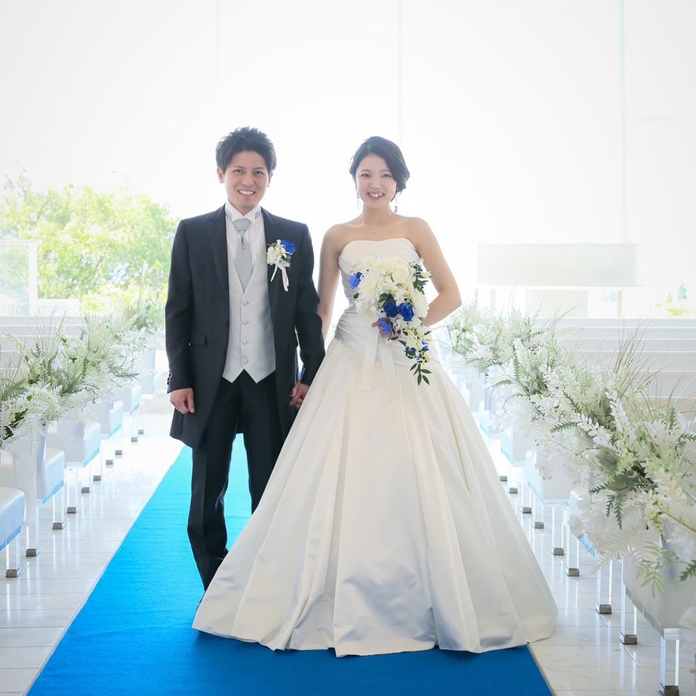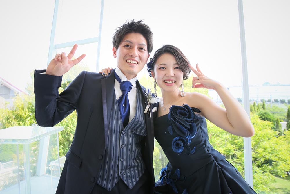 新郎新婦でカラーがリンクしてるのでスッキリとしたおしゃれな着こなし。