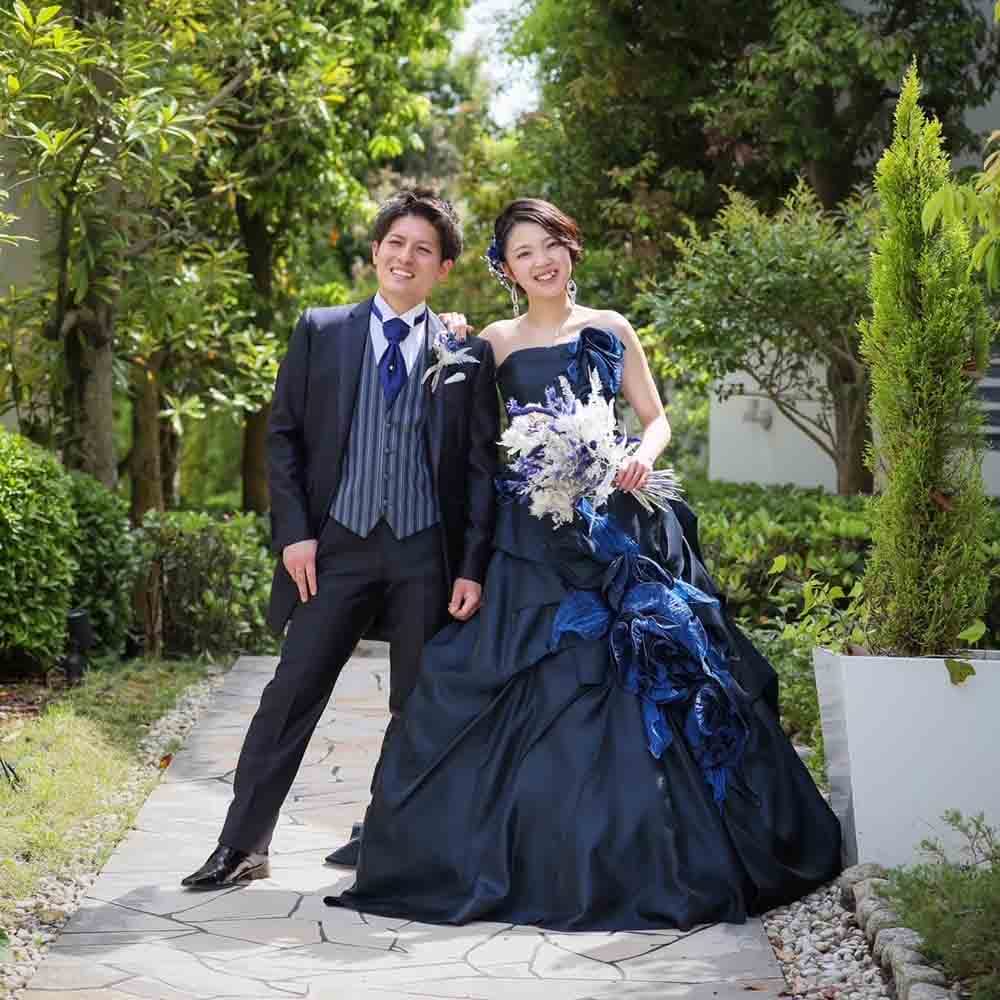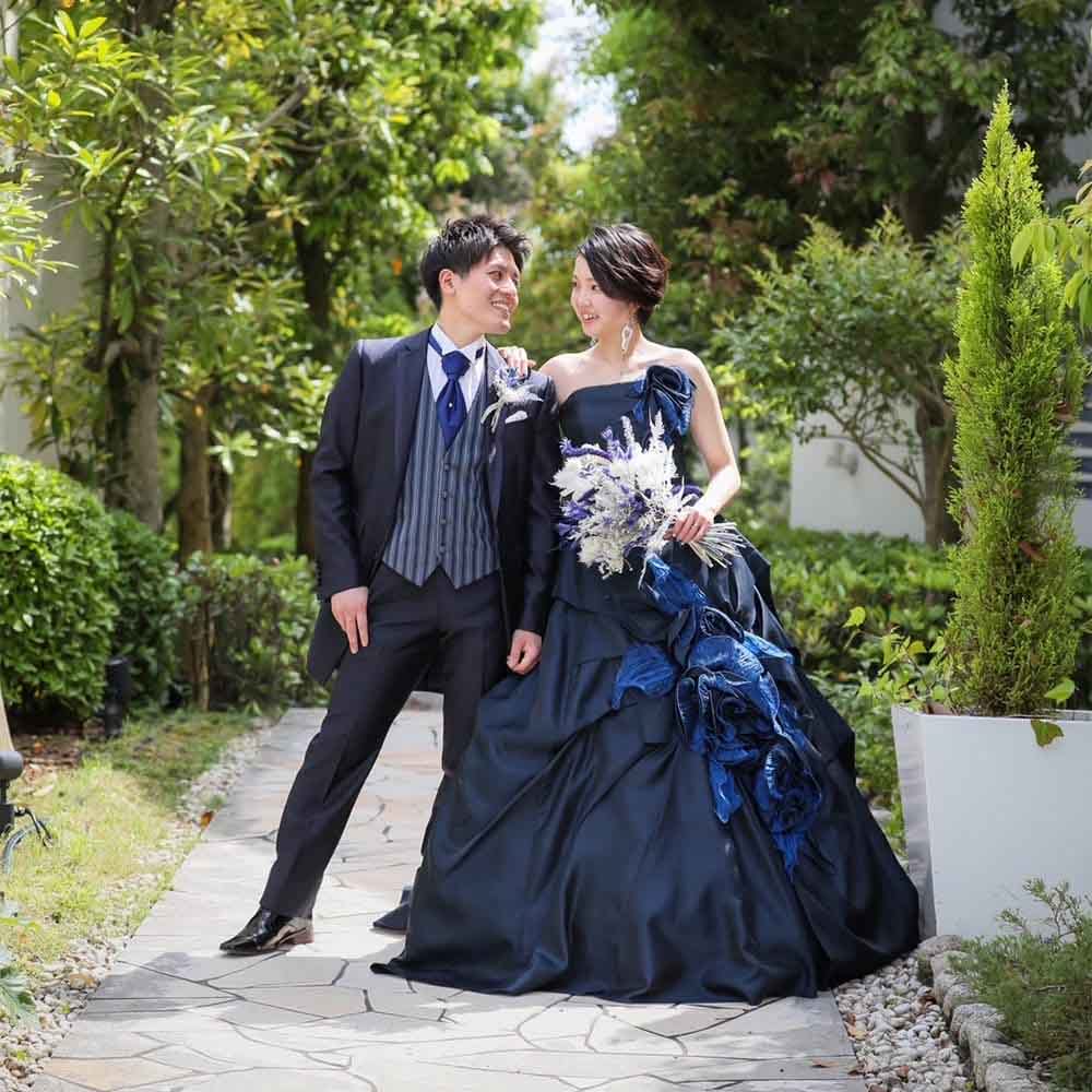 ダークカラーのカラードレスがまた素敵です♪こちらのドレスにも青いバラがちりばめられてるんですよ~!