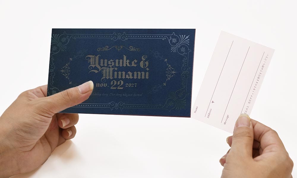 T様はこちらの招待状をとっても気に入っていただいたようで、おそろいの席次表と席札もセットでご注文いただきました!