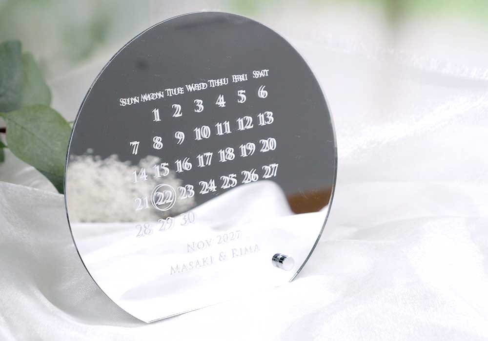 次に、こちらミラーカレンダー。カレンダーデザインって・・・・好きな人多いですよね♡大切な日にしるしをつけるからまさに結婚式アイテムとしてぴったり。特別感もあってオシャレ。コロンと丸いCUTEなフォルムとシルバーのアクリルミラーの相性も抜群。
