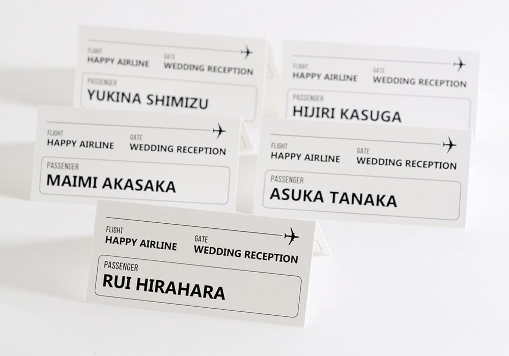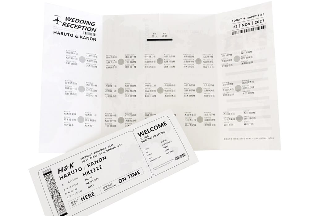 以前からファルベで人気のエアチケットデザイン。招待状、席次表、席札バージョンがやっとリリース!便名はイニシャルと挙式日、到着地はHAPPYLIFEと遊び心満載!このタイプ、招待状はよく見るけど席次表は珍しいかと。航空券風は旅行好き、遠距離カップル、国際カップルの方にぜひ選んでもらいたいです。