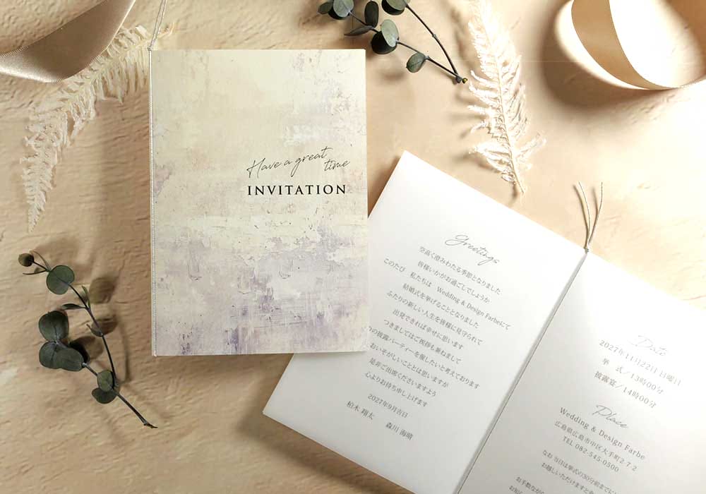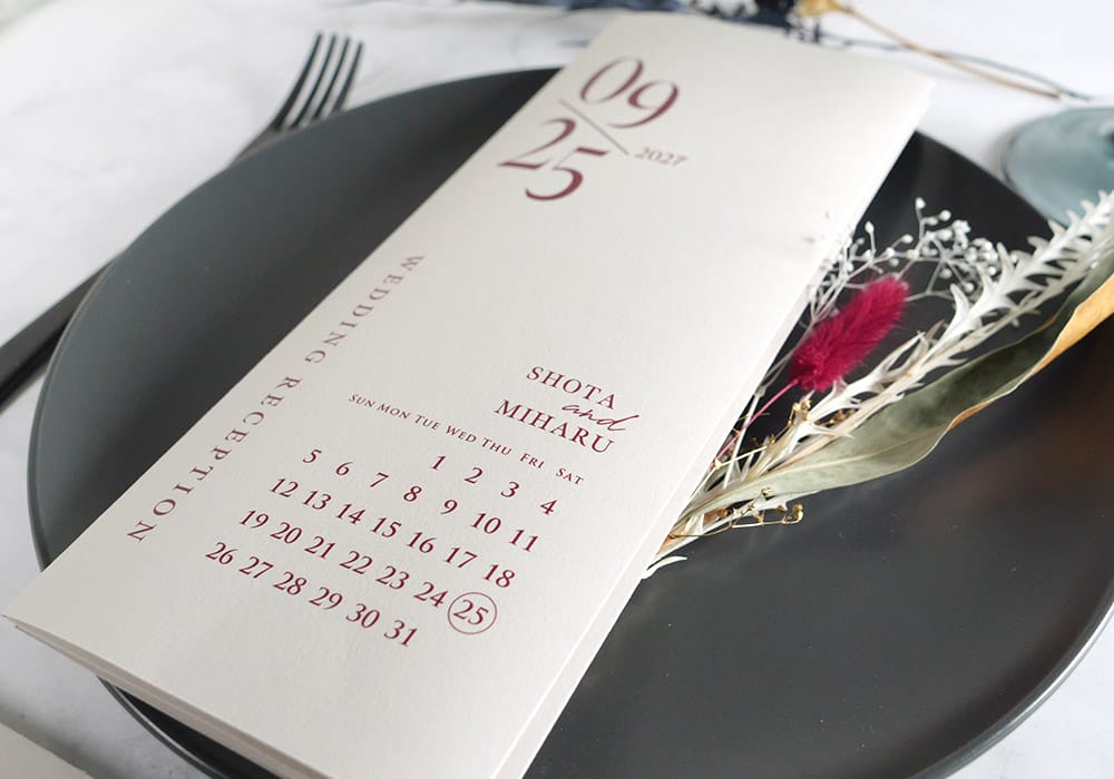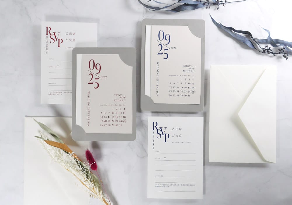 こちらの特徴はなんといってもカレンダーがデザインされていること。大切な結婚式の日を○丸で囲ってゲストにも共有。特に招待状は伝えやすいですよね。アッシュグレーの用紙に落ち着いた色をのせ、相性も抜群。大人クール、シンプルな結婚式をテーマの人におすすめです。