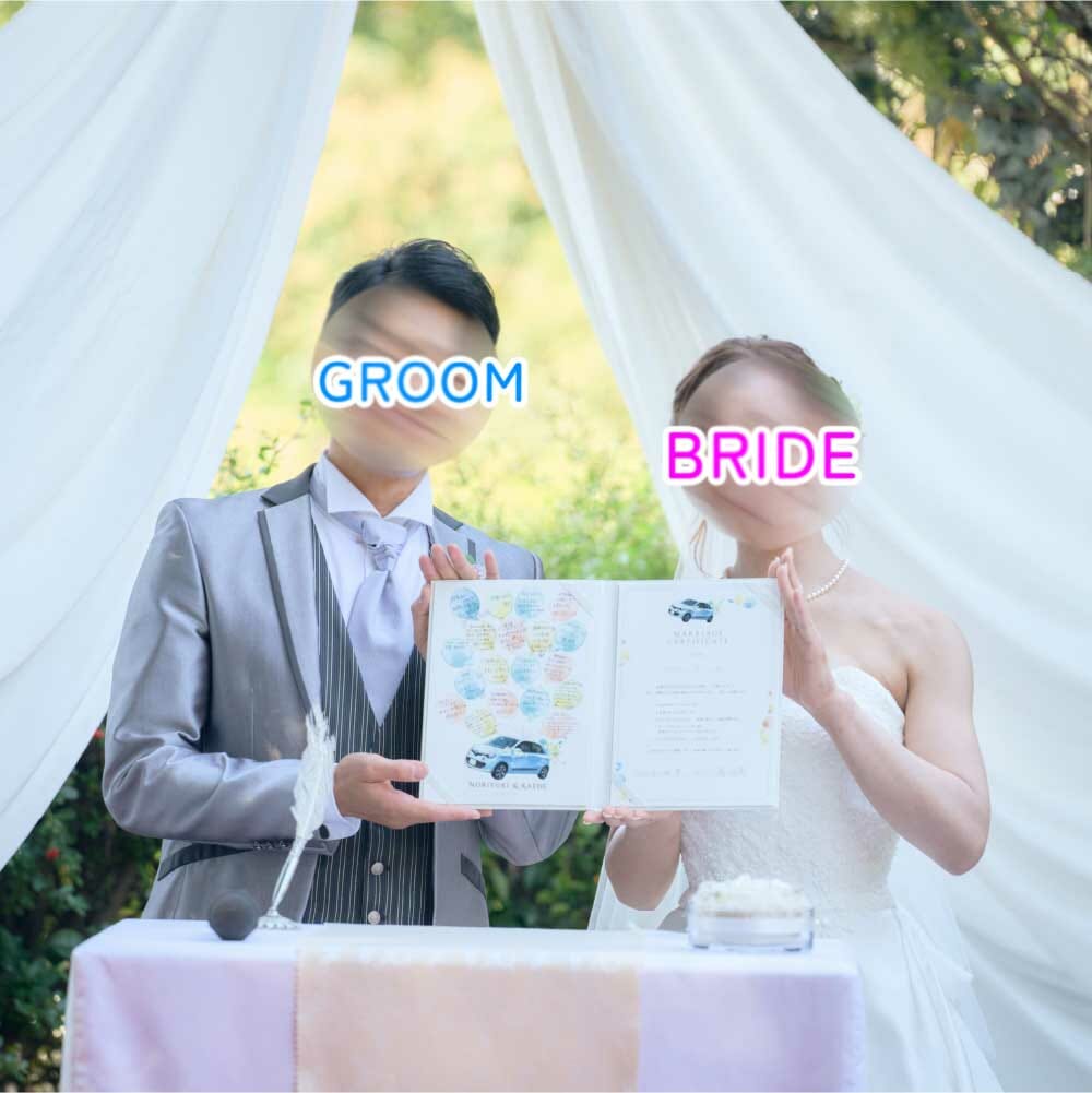 N様:結婚証明書のデザインをどうするか悩んでいた時、愛車をイラスト化した証明書があることをHPで拝見しました。もともとバイクだけではなく、車でドライブしたり旅行に行くことも好きでしたので、自分の愛車を証明書に取り入れることにしました。ちょうど車も水色でしたし、サムシングブルーはこの結婚証明書で!!!結婚してからはバイクに乗る機会は減り、二人でどこかに出かけるなら電車や車が多くなっていたので、バイク以外の要素も入れられてよかったです!