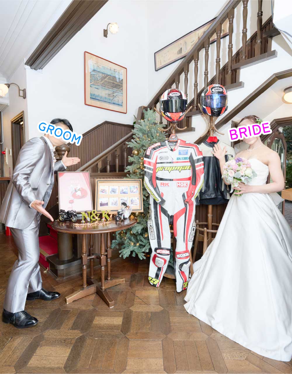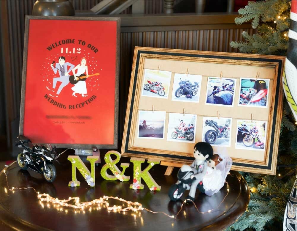 N様:結婚式の規模の大小に関わらず、いつか自分が結婚式を挙げるならバイクの要素は絶対に入れたいと思っていました。主人は私の「やりたいようにやっていいよ」と言ってくれていたので、結局とことんこだわりました(笑)