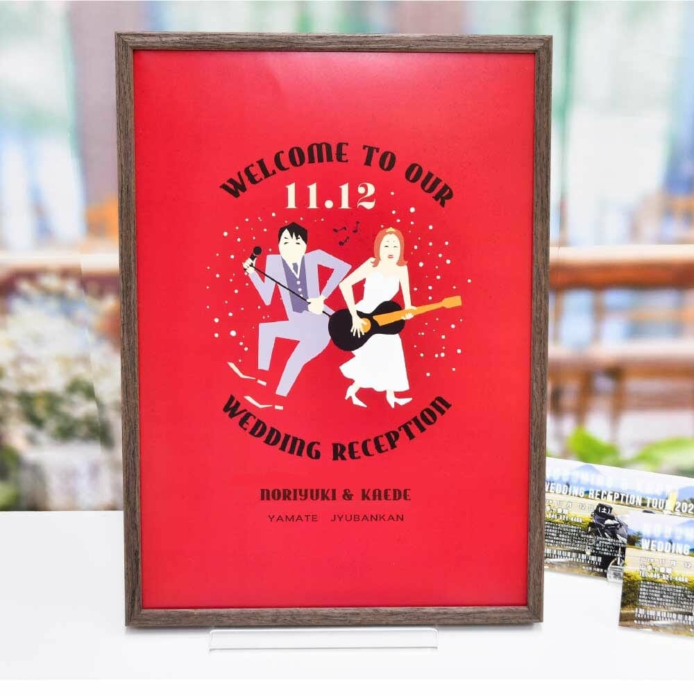 マイクとベースギターを抱えた新郎新婦とオートバイにまたがった新郎新婦がお出迎えしてくれます。
