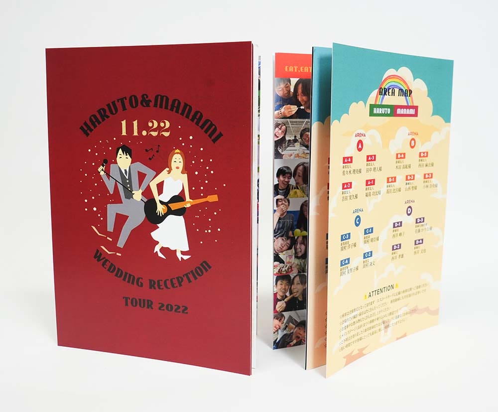 N様:表紙のデザインも、レトロなデザインの新郎新婦が歌ったりベースを弾いたりしている姿を表していただけて、とても満足しています。裏表紙の席次表はフェスみたいで可愛い!と音楽仲間の友人から好評でした。