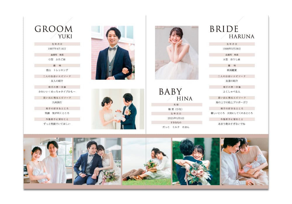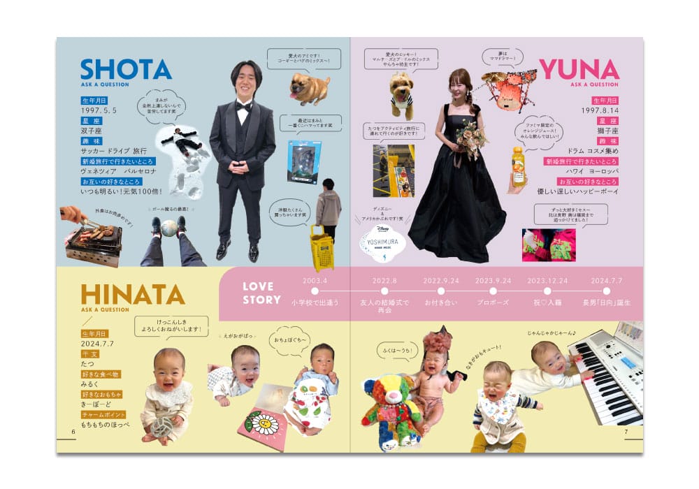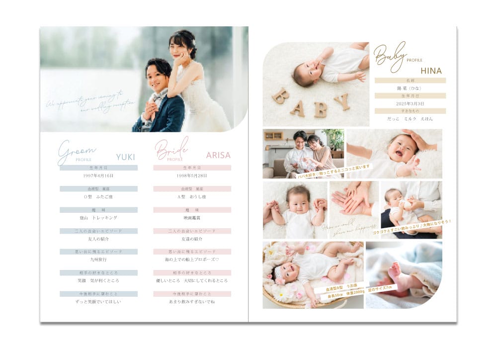 まずご紹介するのがこちら。一番人気のレイアウト図。見開き2ページに新郎新婦それぞれのプロフィール、そして下部にお子様のプロフィールを。背景に色を付けて区切りもわかりやすく。紹介するのは基本項目とさらに、切り抜きお写真に吹き出しでセリフをつければほっこり可愛い仕上がりに。
