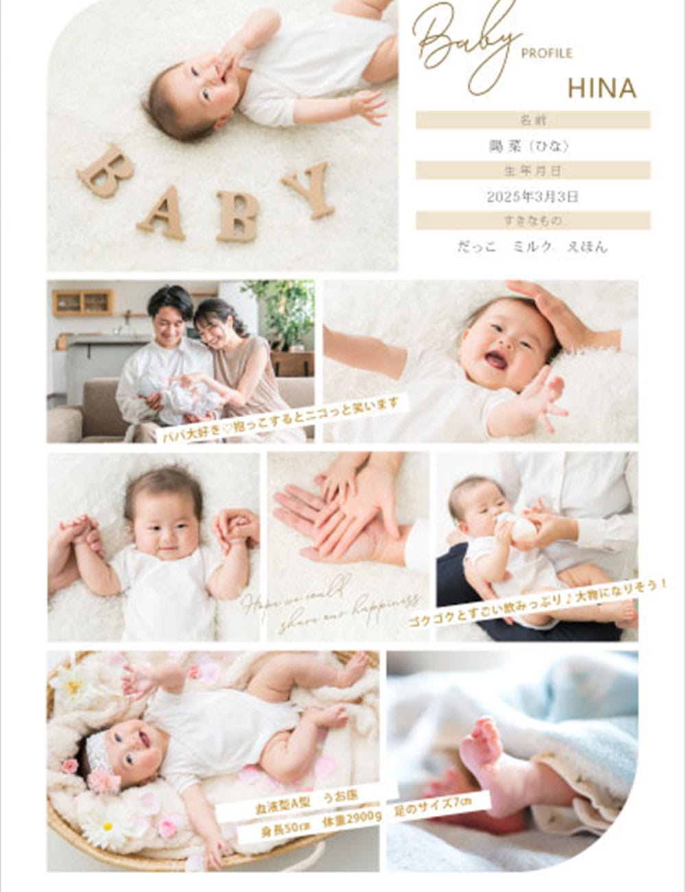 最後に紹介するのが、1ページお子様紹介で使うタイプ。お子様のプロフィールや近況はゲストにとって初耳なので思い切ってたくさん紹介しちゃうのもアリ!?!