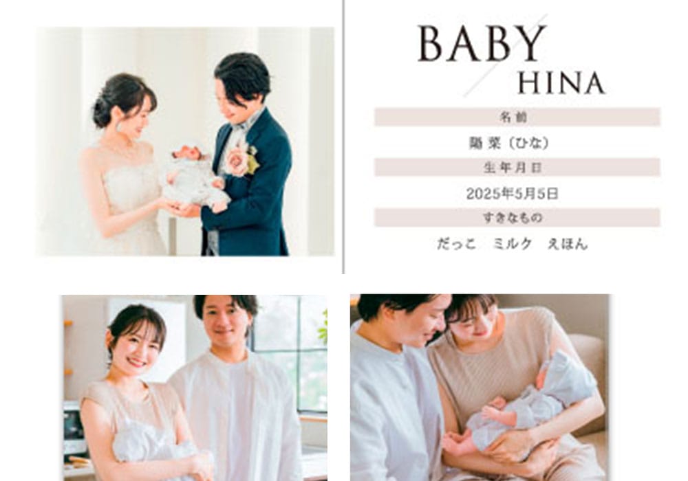 次にご紹介するのがこちら。わが子の誕生をゲストにお披露目したいけどこのご時世だから形に残すもので紹介するのは控えたい。そんな方はシンプルに掲載するのがおススメ。