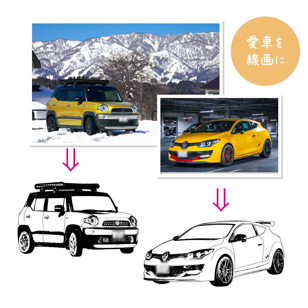 その写真をもとに、車の特徴を丁寧に捉えた線画を制作し、アクリル素材に美しくレイアウトしてデザインに組み込みます。