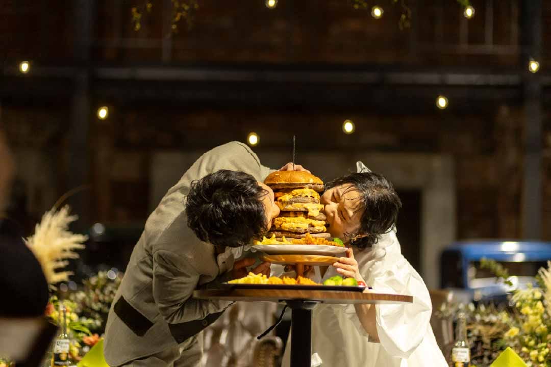 こちらの式ではおふたりが作った特大ハンバーガーに豪快にかぶりつくという自由すぎる演出に!