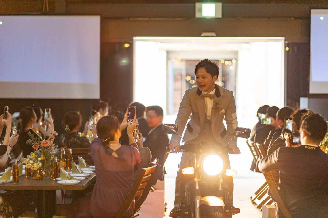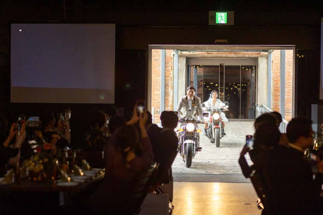 披露宴の入場ではなんと!おふたりそれぞれが愛車のバイクで颯爽と登場!!