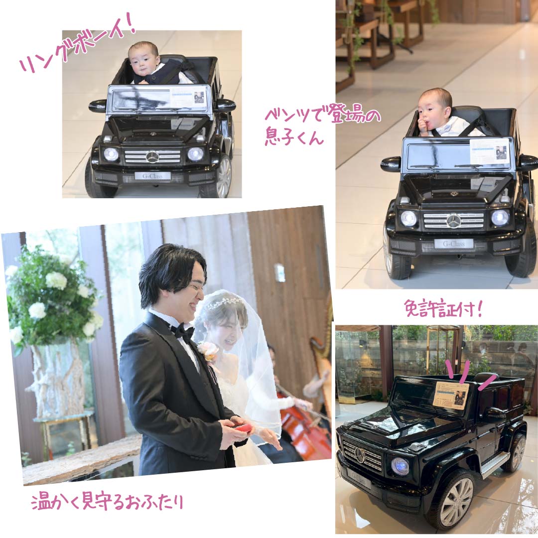 挙式のリングボーイは、息子くんがパパの操縦するベンツのゲレンデに乗って登場!