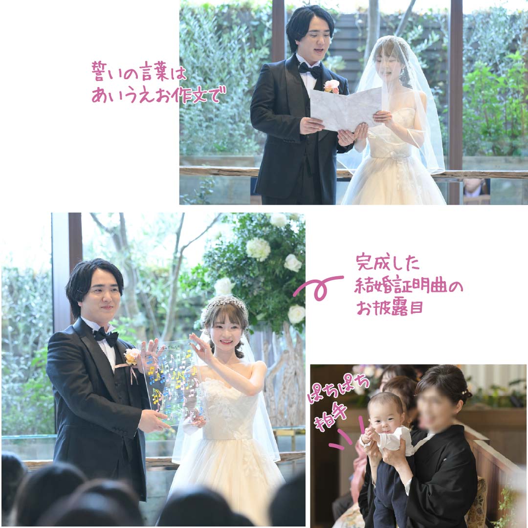 誓いの言葉は、おふたりがご両親から贈られた大切なお名前を使って、「あいうえお作文」に。感謝と決意が優しく伝わる、心あたたまる時間となりました。