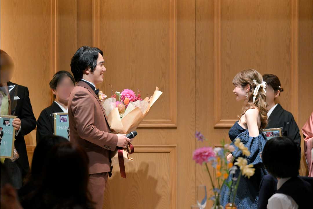 少し照れながらも、ゲストの皆様へのサプライズとしてご用意された演出は、おふたりらしさが詰まった温かなワンシーンに。