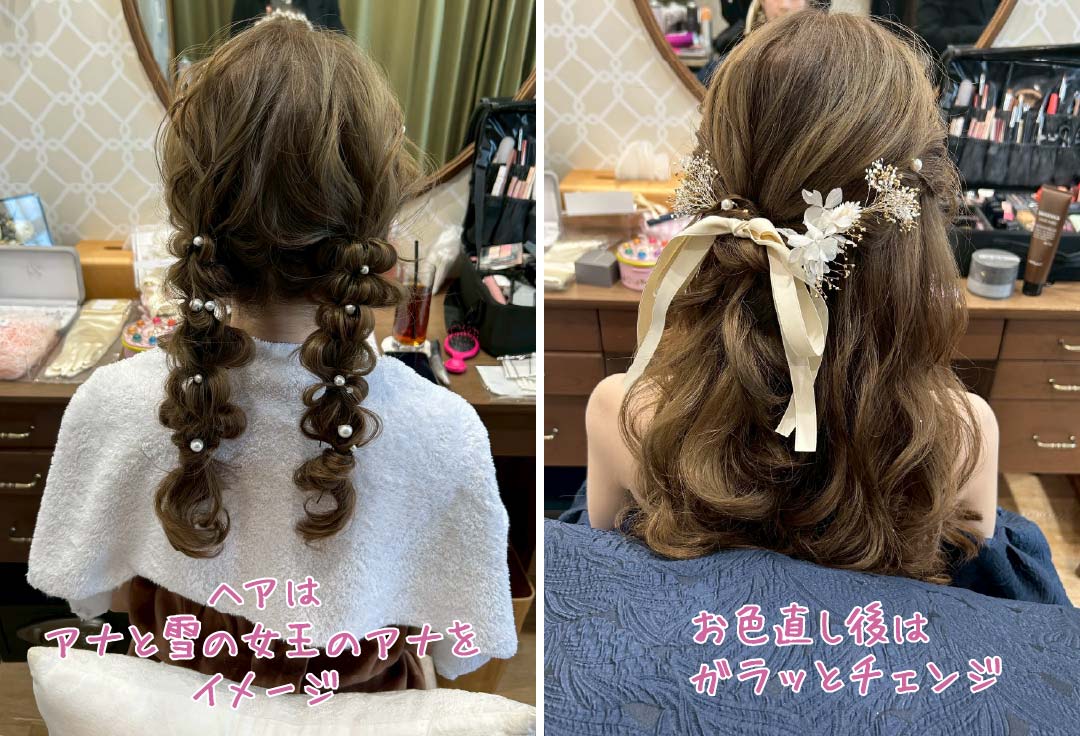 ヘアはアナと雪の女王のアナを目指し360°いい感じに見えるように、お色直し後はガラッとチェンジ。素敵です♡