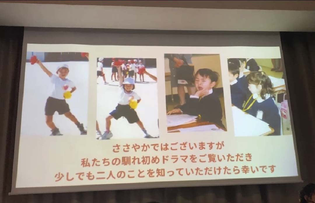 披露宴のスタートを彩ったのは、おふたりの幼馴染時代からの馴れ初めを描いたオープニングムービー!