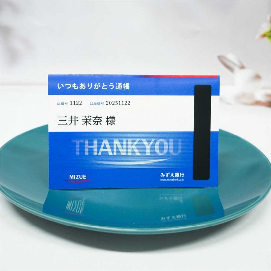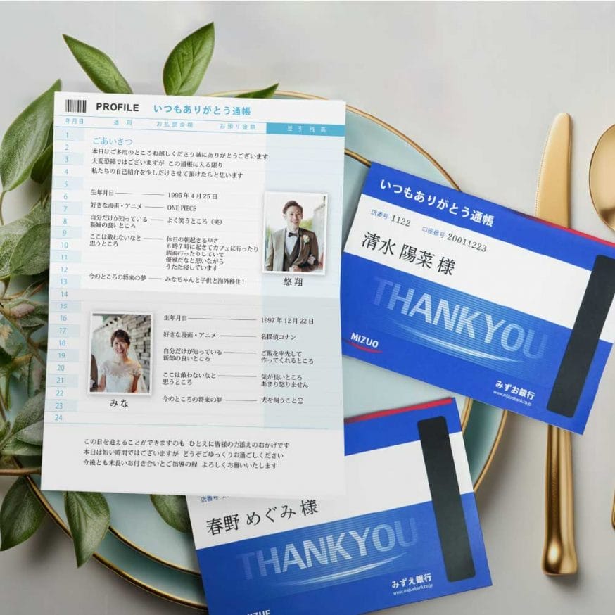 こちらは通帳の形を活かして、席札に加えプロフィール入りのアレンジが大人気!