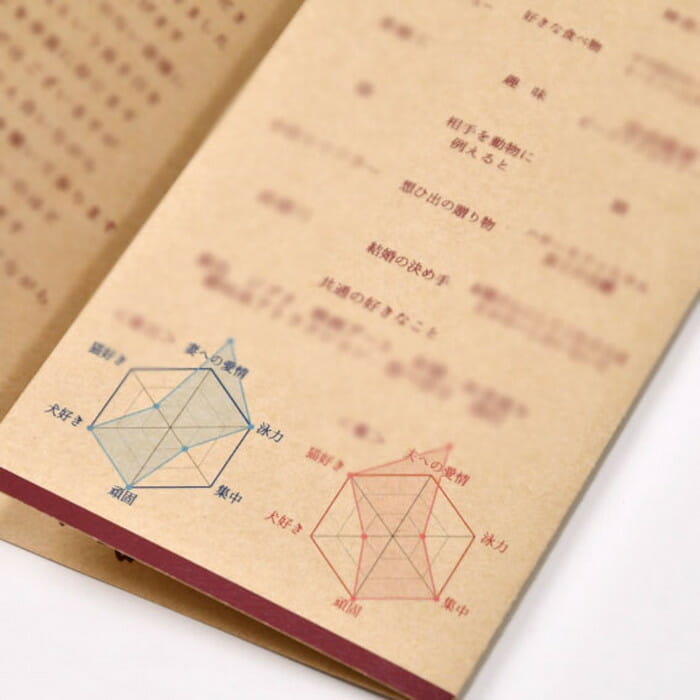 残りのスペースには、ご挨拶文やプロフィール、性格グラフもいれてユーモアあふれる仕上がりになっています。