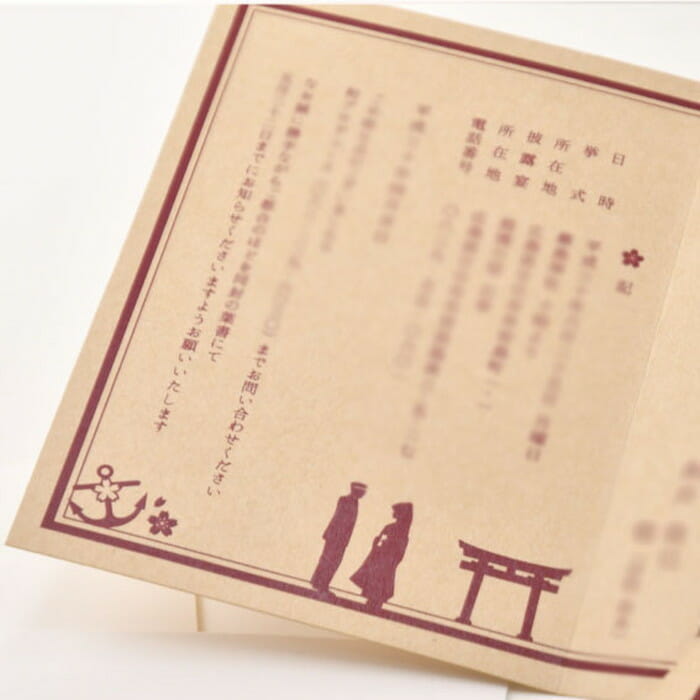 新郎様はご職業である海上自衛官の制服姿で新婦様はシロムク姿をシルエットにしてメインに配置。その他のモチーフもその周りにあしらっていきました。取り寄せたヴィンテージクラフトペーパーに映えるよう選んだ色は渋めのエンジ。クラフト×エンジの組み合わせでレトロ感がぐっとあがり、落ち着きのある招待状になりました。