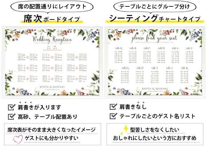 ゲストの人数に応じたサイズと料金をご用意していますので、一人一枚ずつ席次表を作るより断然お得になるのも見逃せないポイントです!