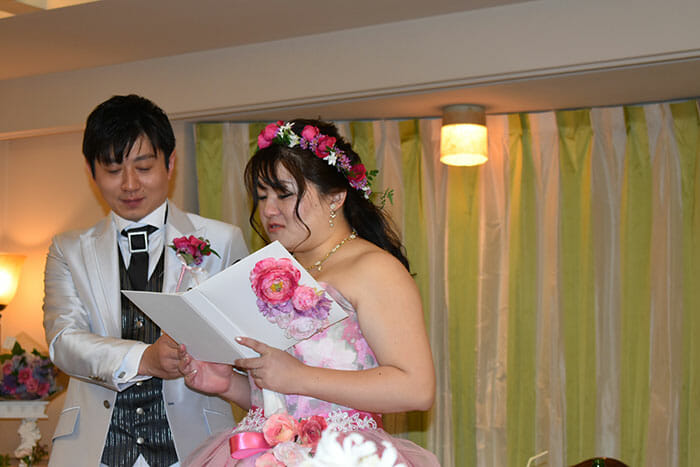 やさしいグリーンを基調とした会場に映えるピンクのドレス。花嫁の手紙のカバーにアレンジされたお花が、花冠やブーケとも相性抜群でまさに写真映えも最高です♡