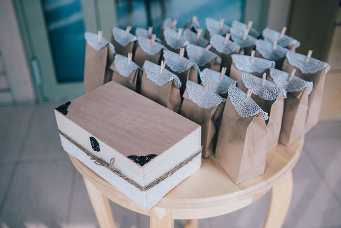 クラフトペーパーの袋にプチギフトを入れて、レースのペーパーとウッドピンチで留めたアレンジ。お友達同士のカジュアルなパーティなどで使えそうなアイデアですね♡
