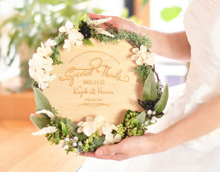 読む姿が美しく、手紙がギフトになるというスグレモノ。手書きの文字が木製プレートに彫刻されるのでご両親へ贈る、温かみのある手紙兼記念品になります。