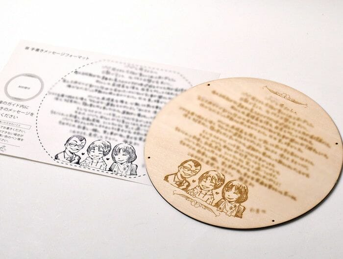 すごいですよね~!!!届いた原稿には丁寧な手紙そして、ご家族の似顔絵が。めちゃめちゃ素敵で上手でスタッフ一同感激。そしてこんな風に絵もきれいにレーザー彫刻されました。すばらしい♥♥♥