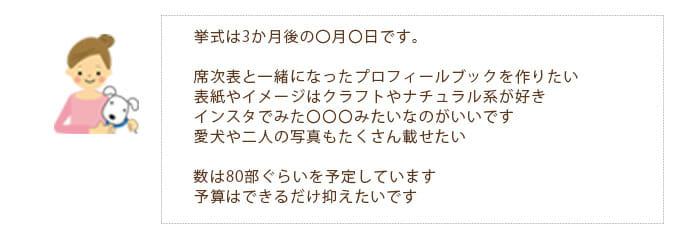 つまりお二人の希望するものがが簡単にできちゃうのか予算がかかりそうなのかまずはしっかり伺ってお見積りをさせていただきます。過去作品も参考にしてくださいね。