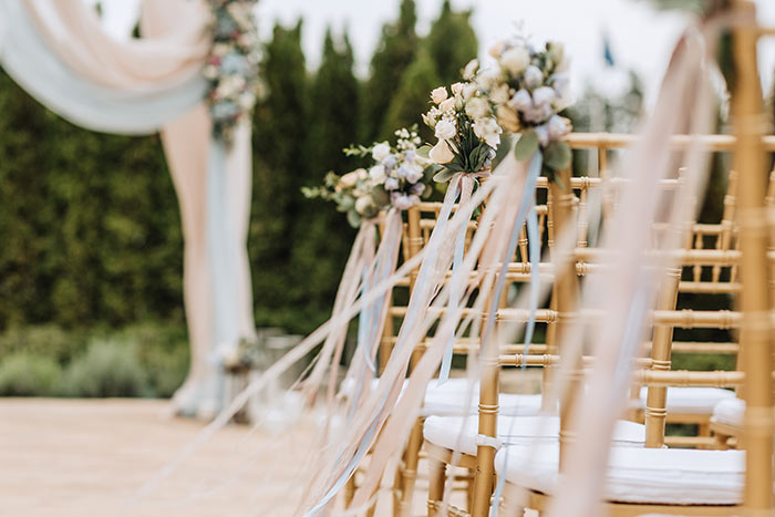 こちらも屋外のガーデンウェディングで真似してみたいアレンジ。参列者が座る椅子にブーケとリボンをデコレーションすれば、風になびいてさらさら揺れるリボンが何とも絵になりますよ♡
