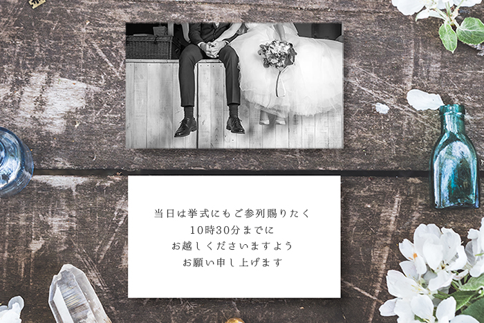 式場によっては、挙式が終わって披露宴が始まる前のタイミングで、出席者全員を入れた写真撮影を行うこともあります。この場合、挙式に参加しないゲストには、「写真撮影のために披露宴の前に来てください」と伝えるための付箋を同封します。